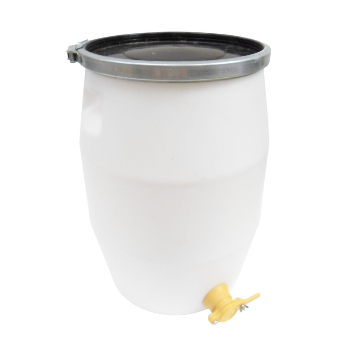 Fût avec couvercle, grenouillère métal et robinet certifié contact alimentaire adapté à un grand nombre d'utilisation. Pour le transport ou le stockage de produits liquides ou solides contenance 50 litres. Empilable
